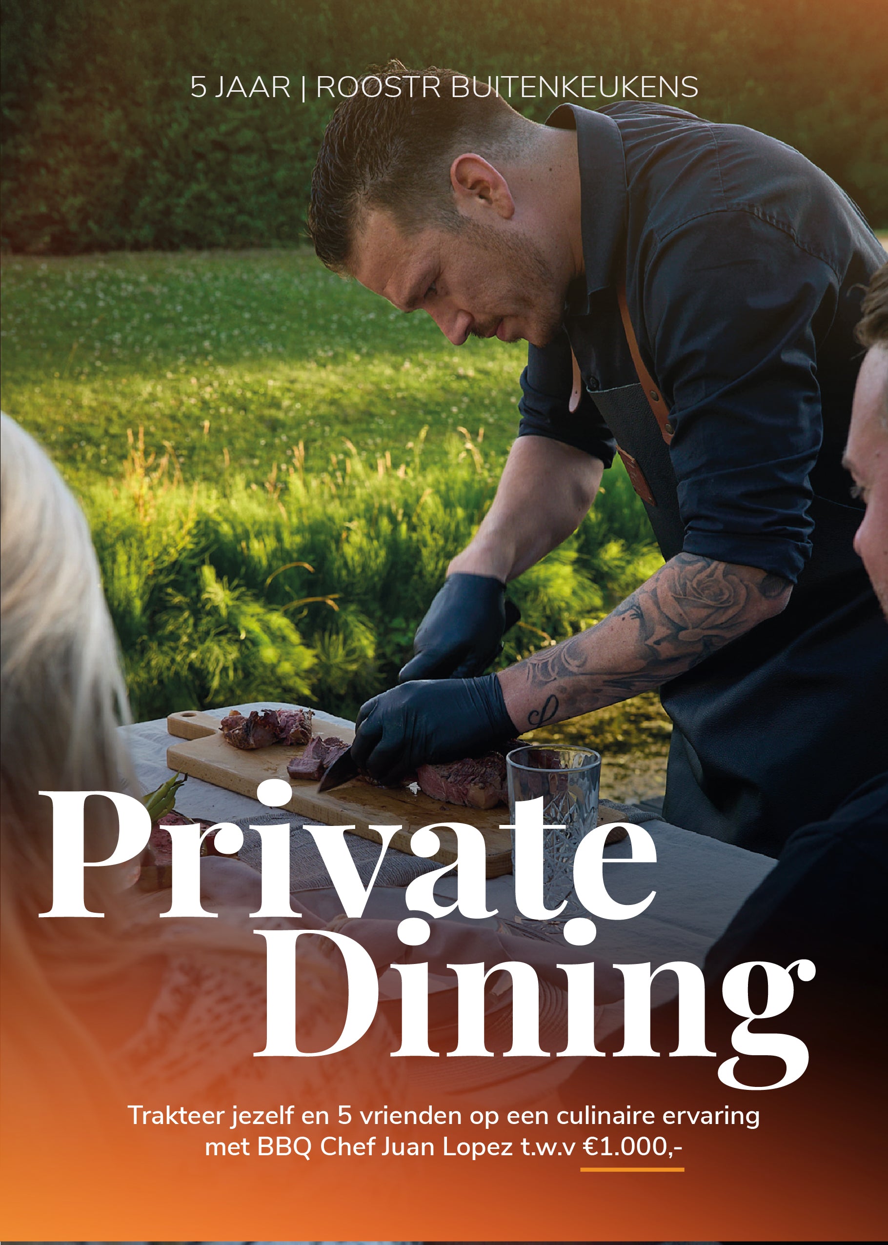 De private dining vindt plaats op een locatie in overleg met chef Juan Lopez (meestal bij jou thuis met jouw Roostr buitenkeuken).